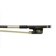 This gorgeous, full carbon fiber cello bow has a braided or weave pattern infused in red. The frog is ebony and fully lined with a fleur pattern.