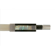 Carbon Fiber bow with premium horse hair, full silver mounted ebony frog, nickel silver winding, select Parisian pearl eye & slide, three-part button, and leather grip. Superior playability, responsiveness, styling, craftsmanship, and materials.