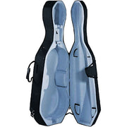 A deluxe, lightweight cello case on wheels with high-density polystyrene protection and 600 denier Cordura nylon exterior. It is water resistant and designed for moderate impact resistance, plus features a lovely plush interior, two bow holders, accessory pocket, exterior music pocket, backpack system straps, extra handles, and padded neck support.