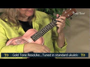 The Gold Tone ResoUke is a concert-scale resonator ukulele designed to deliver projection and clarity that surpasses standard wooden ukuleles. Its reverse-cone resonator with biscuit bridge and brass body give it a distinctive, powerful tone. The removable palm rest on the Gold Tone/Beard resonator coverplate allows easy adjustments without detaching strings—perfect for tailoring action, break angle, and right-hand comfort. Outfitted with a bone nut, Canadian hard rock maple saddle, and Kluson-style tuners, it combines durability with authentic tonal response. Includes a heavy-duty gig bag and is also available in a left-handed model.