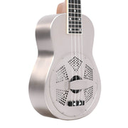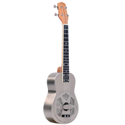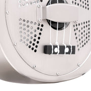 The Gold Tone ResoUke (Tenor Scale) is a resonator ukulele designed to deliver greater projection and clarity than standard wood-bodied ukes. Its reverse-cone biscuit resonator system and brass body produce a bright, metallic tone that cuts through ensembles with ease. The removable palm rest makes it easy to adjust string action, break angle, or replace the bridge saddle without dismantling the entire coverplate.